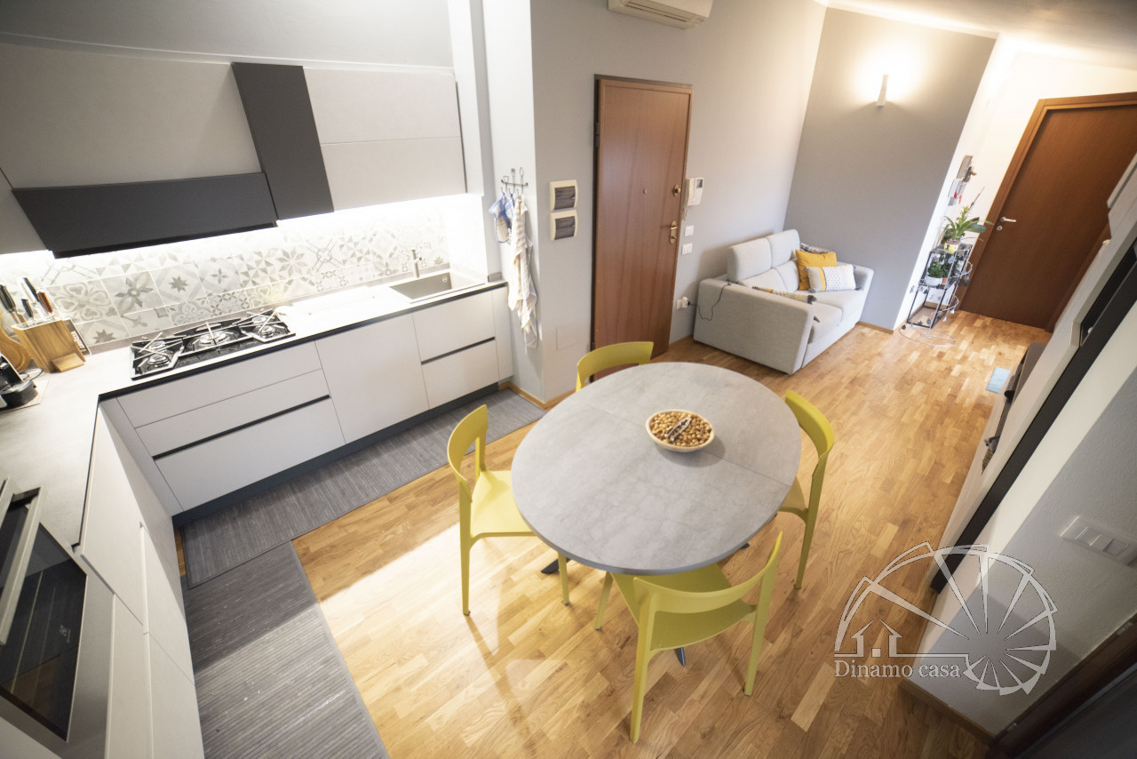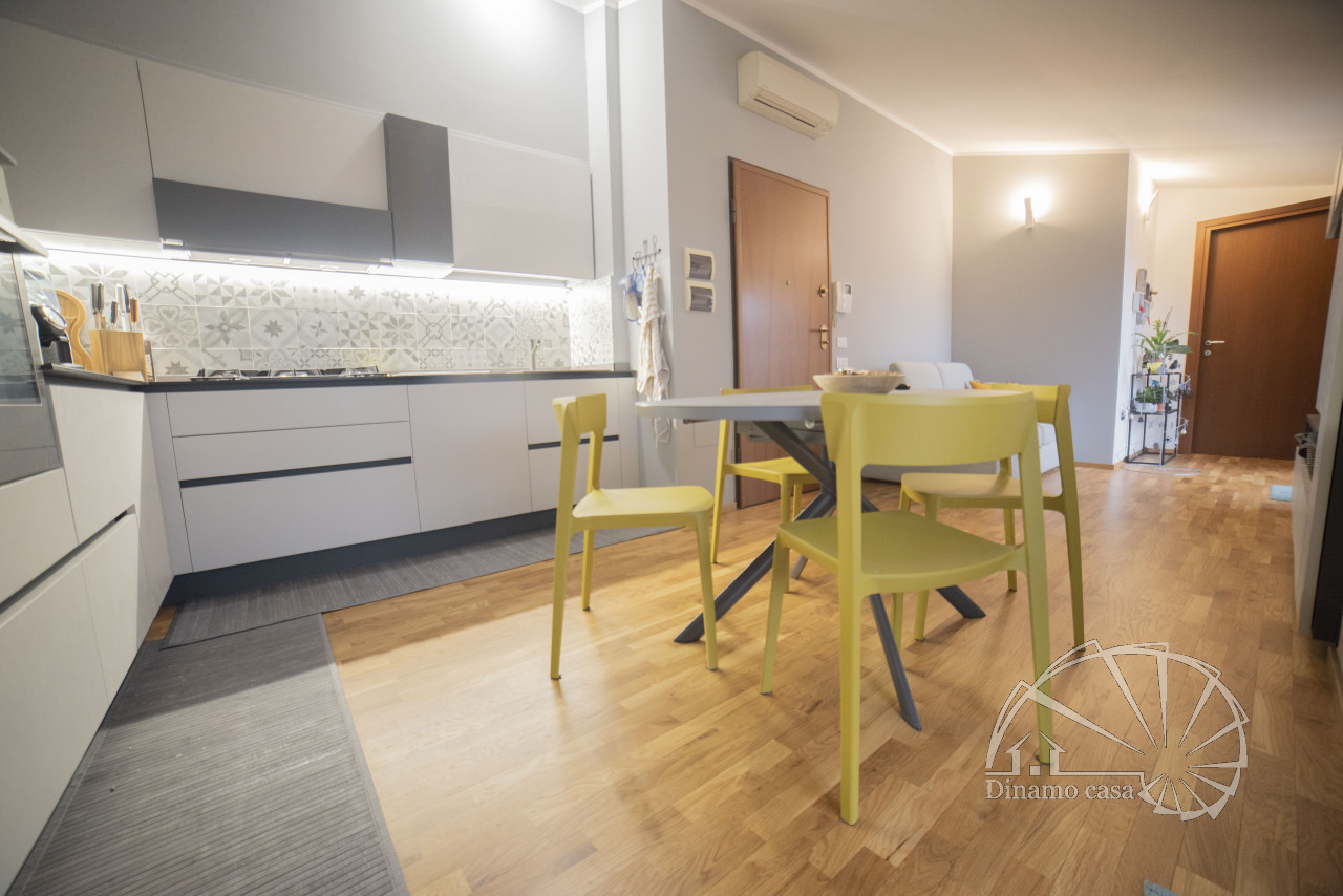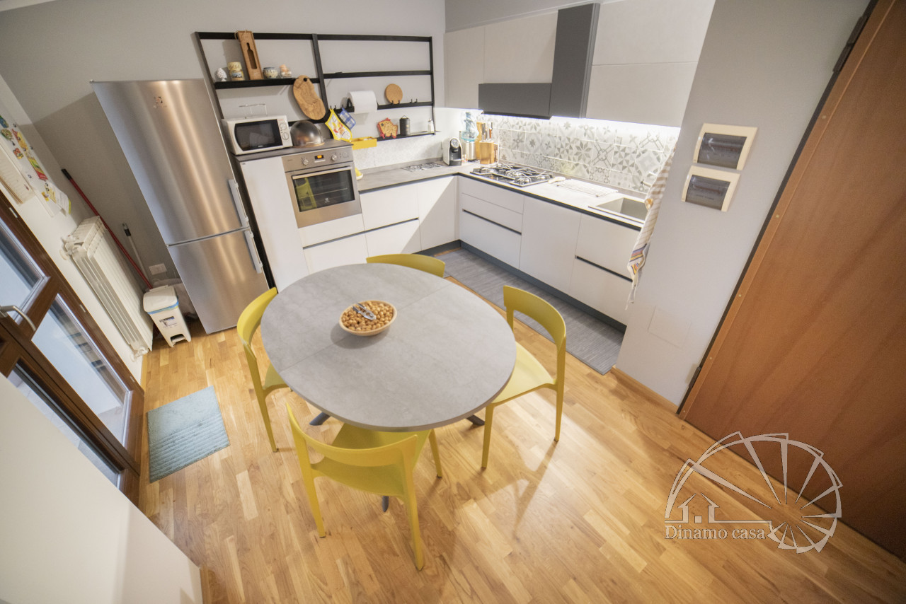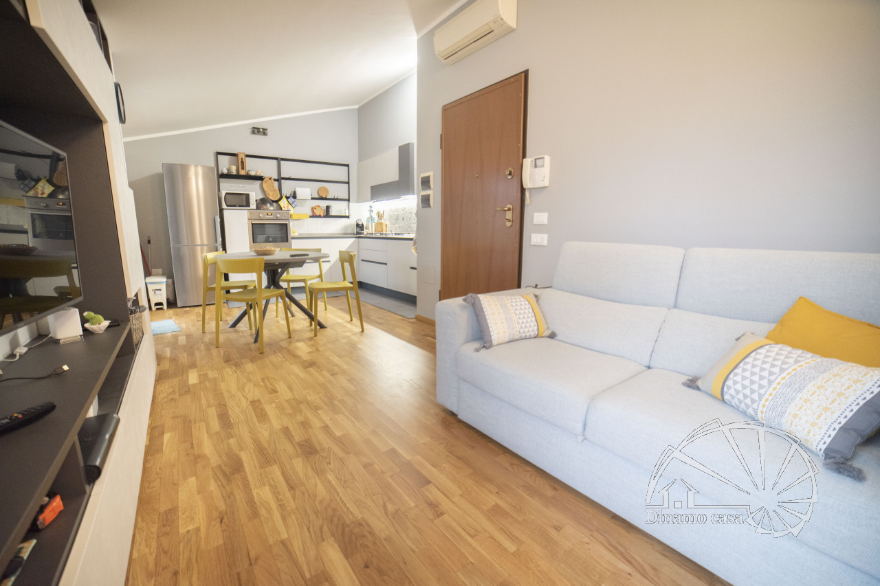 Gli spazi interni sono ben distribuiti: entrando troviamo un accogliente soggiorno che conduce alla cucina open space completamente attrezzata. Le due camere da letto offrono uno spazio generoso e tranquillo per riposare. Il bagno è modernamente ristrutturato ed equipaggiato con finiture eleganti.